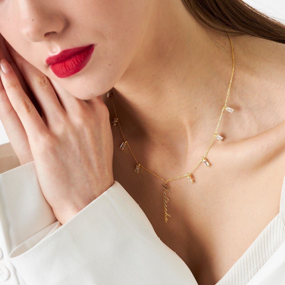 Asker Jewelry güvencesiyle üretilen Baget Taşlı İsim Kolyesi - 925 Ayar Gümüş, orijinallik sertifikasıyla birlikte teslim edilmektedir. Sevdiklerinize özel bir hediye arıyorsanız, Baget Taşlı İsim Kolyesi modelimiz mükemmel bir seçimdir.