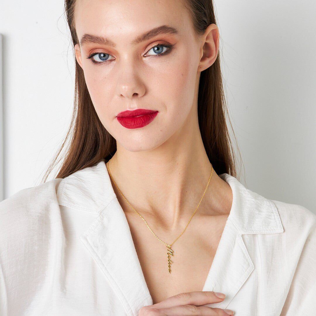 Günlük kullanımda ya da özel davetlerde, İsim Kolyesi El Yazısıyla Yazılmış İsmin Yer Aldığı Dikey Kolye tarzınızı tamamlayacak ideal bir seçenektir. Hafif yapısı sayesinde uzun süre konforla kullanılabilir. Güçlü kilit sistemi ve sağlam zincir yapısı güvenli kullanım deneyimi sunar.