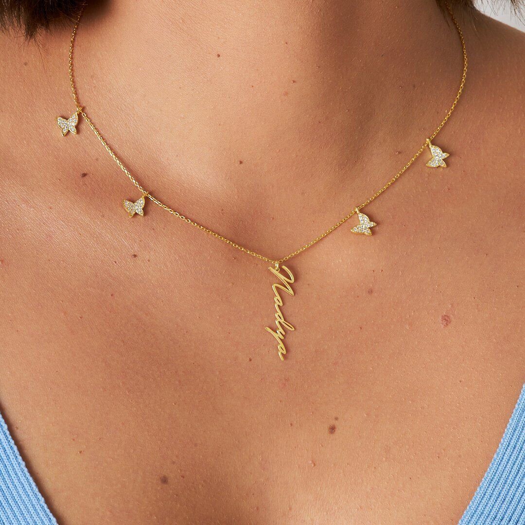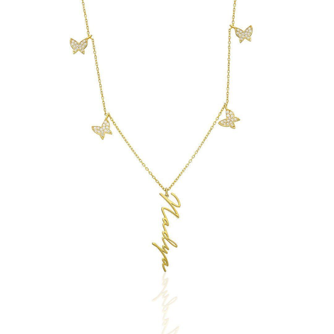 İsim Kolyesi Kelebek Sıralı Dikey İsim Kolyesi - 925 Ayar Gümüş, 925 ayar gümüşün zarifliğini modern tasarımla buluşturuyor. El işçiliğiyle üretilen bu İsim Kolyesi Kelebek Sıralı Dikey İsim Kolyesi, her kombine uyum sağlayan şık bir aksesuardır.