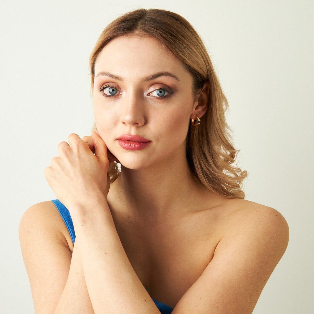 lacivert taşlı çizgili halka küpeler